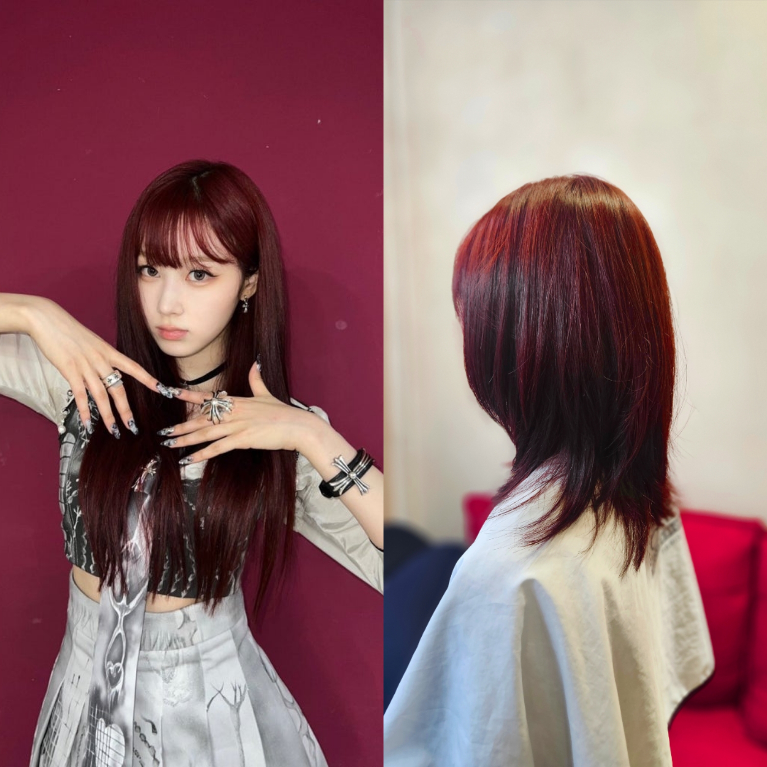 왼쪽은 레드브라운 컬러로 에스파 지젤 스타일 컷,